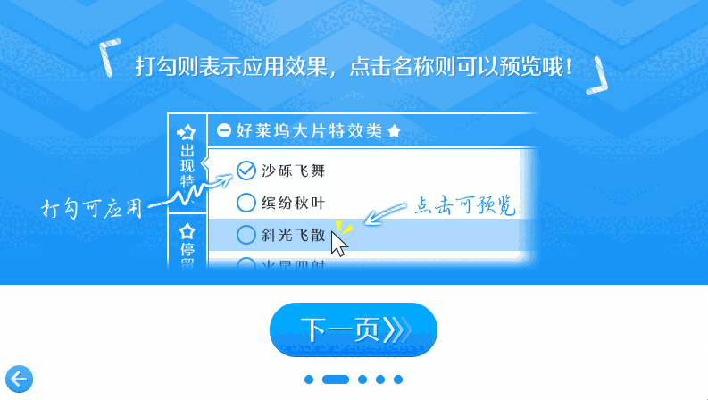 琳琅满目的超炫特技效果,方便您创作的方方面面,还能一键轻松达成。比如:一秒钟做出影院级的好莱坞文字特效(包括风沙、火焰、水墨特效等),轻松调用多达上百种专业风格效果(囊括各种动态或静态特效技术以及画面修复与调整方案),提供迄今最多的视频切换特效(包括高质量3D和其他专业高级切换特效),瞬间制作乐趣无穷的卡拉OK视频并拥有全球多达16种超酷的文字跟唱特效,不费力气即可制作超炫个性MV(包括首创的MTV歌词字幕同步功能以及众多动感十足的字幕呈现特效),直观高效地为视频加上搞笑的贴图并具备数十种贴图动画效果,为视频应用各种缤纷相框使其更生动迷人,贴心地为视频加水印或去水印…一切都更胜其他,瞬间将您的视频变成声色俱佳的特效大片!
