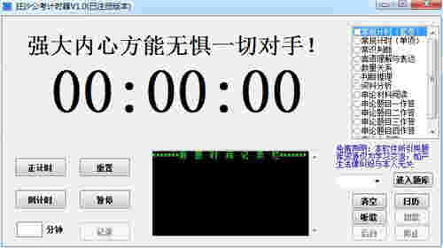 狂沙公考计时器是一款专业的公考计时的工具软件,软件支持正计时和倒计时、在线听歌、推荐题库等功能,十分方便快捷,界面简约,布局直观清晰,操作简单,极易上手,是一款不可多得的利器。