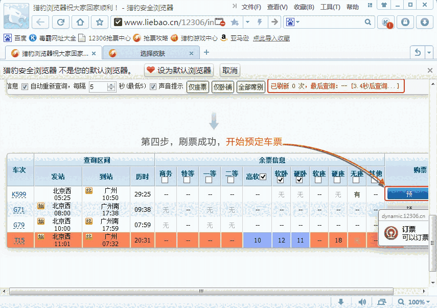 打开猎豹浏览器抢票专版进入订票页面