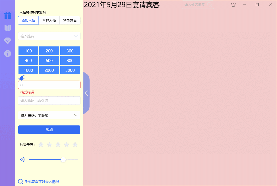 通过预输入姓名,在添加人情时,只需要输入姓名中的某个字,或拼音,或拼音首字母大写,就会自动加载出含有该汉字的名字列表,方便快速选择,也避免因”同音字“而混淆名字的情况发生。