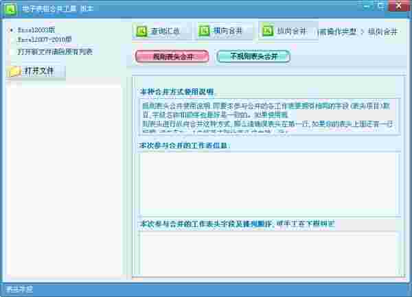 电子表格合并工具是一款专业的电子表格合并的工具软件。支持多个版本的excel进行表格数据的查询汇总,或者垂直、水平单元格合并等操作。十分方便快捷,界面简约,布局直观清晰,操作简单,极易上手,是一款不可多得的利器。