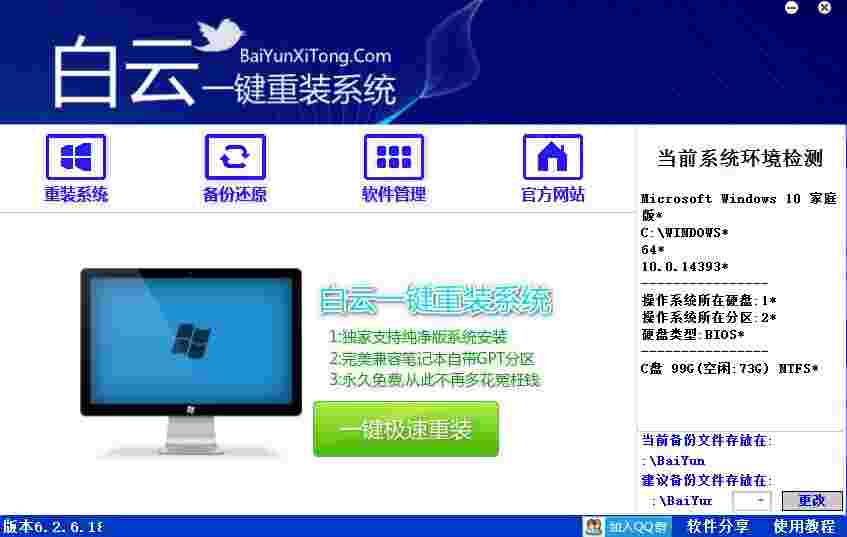白云一键重装系统是一款装机必备的系统辅助类工具软件,软件界面设计美观简洁,布局非常直观清晰,小白也可轻松操作。软件支持一键自动备份、重装系统和还原系统一站式服务,无需多余操作。