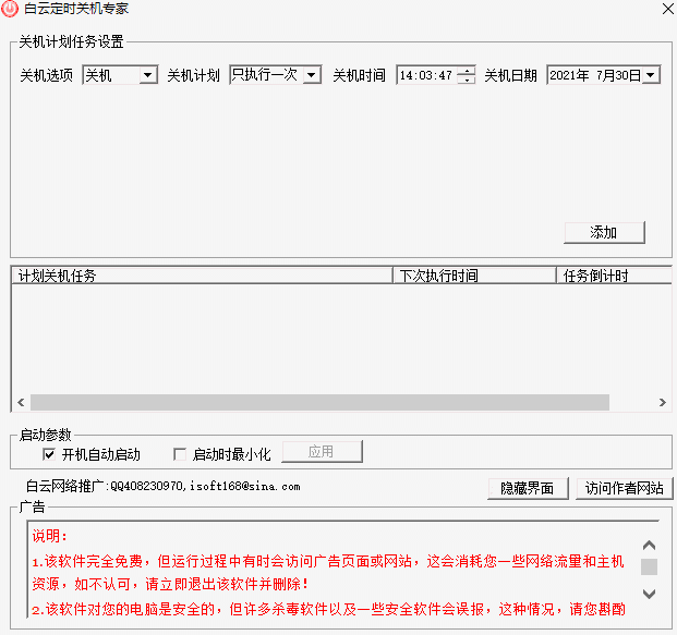 白云定时关机专家为免费软件,无捆绑软件