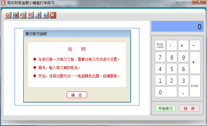 开始后,会提示练习的内容跟注意事项,阅读了解后点击‘确定’键,正式进行小键盘的指法练习~