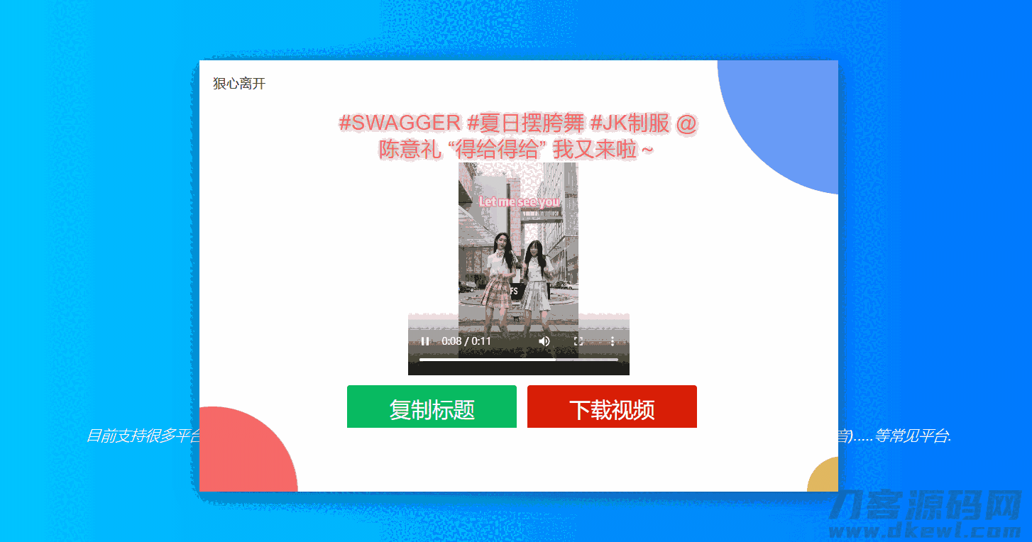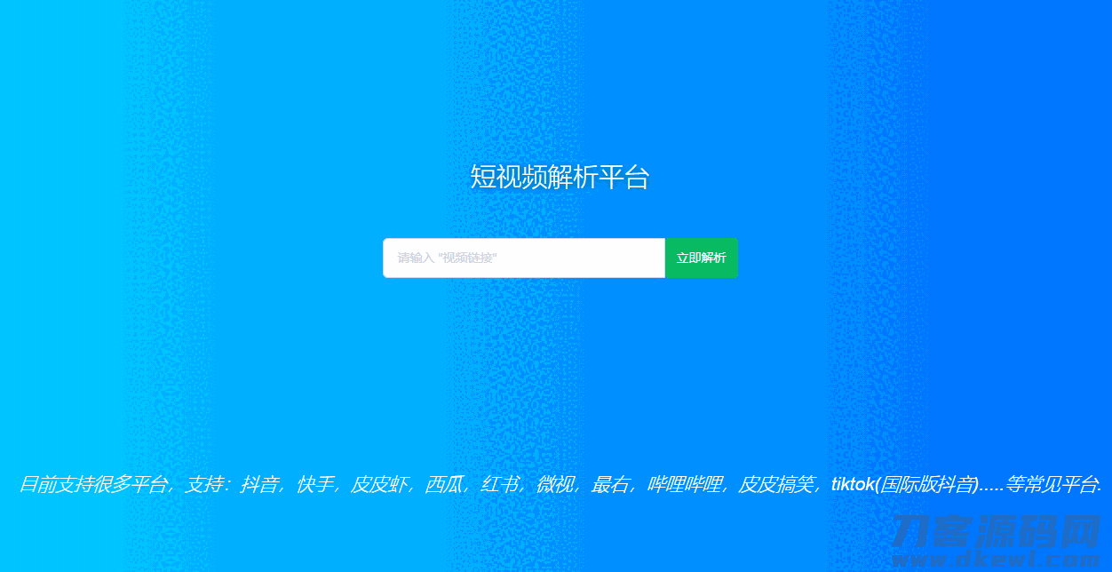 这款解析源码目前支持很多平台,支持:抖音,快手,皮皮虾,西瓜,红书,微视,最右,哔哩哔哩,皮皮搞笑,TikTok(国际版抖音)…..等常见平台!