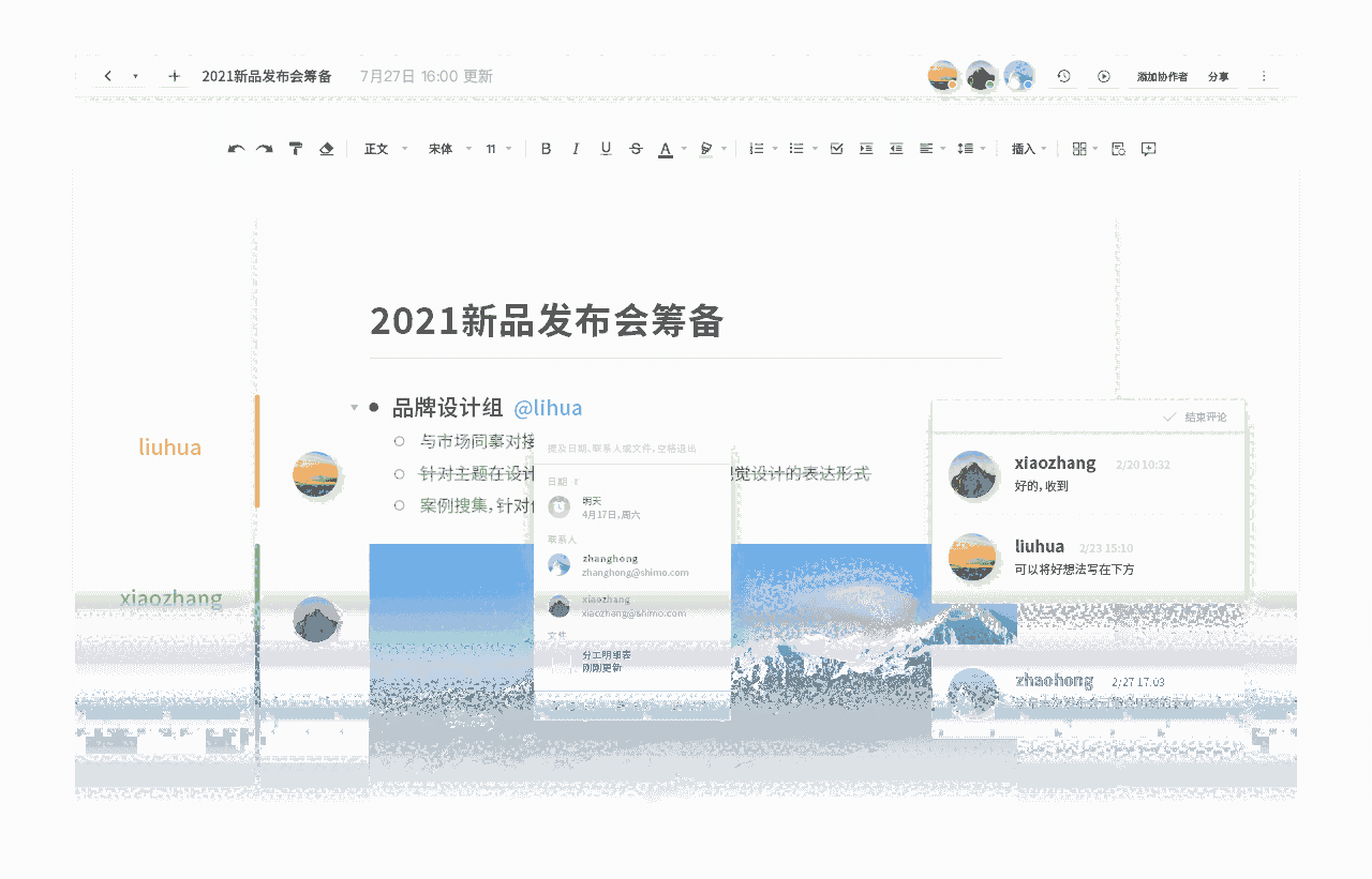 针对文档的某一细节内容,你可以划词评论。这非常适合运营和产品团队用来讨论方案。你也可以用@功能向小伙伴喊话或提及一个文档 。