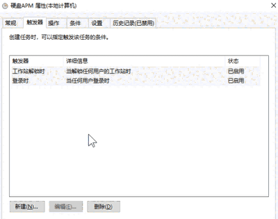 触发器:新建2个触发器,一个是“登录时”,一个是“工作站解锁时”