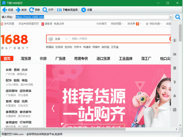 第一步:以1688为例,点击左上角“下载1688宝贝”按钮,弹出窗口中会自动打开1688的首页,如图所示: