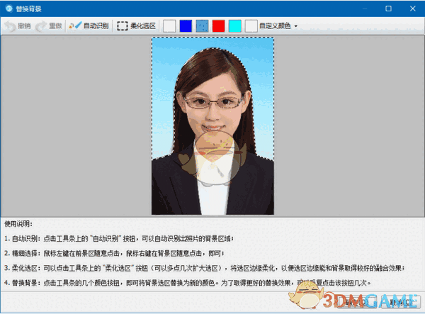 其中虚线为软件自动选择的将要替换的背景部分,如果有误,可按照下方的“使用说明”进行调整。调整完成后,点击“确定”按钮即可完成背景替换,效果如图所示: