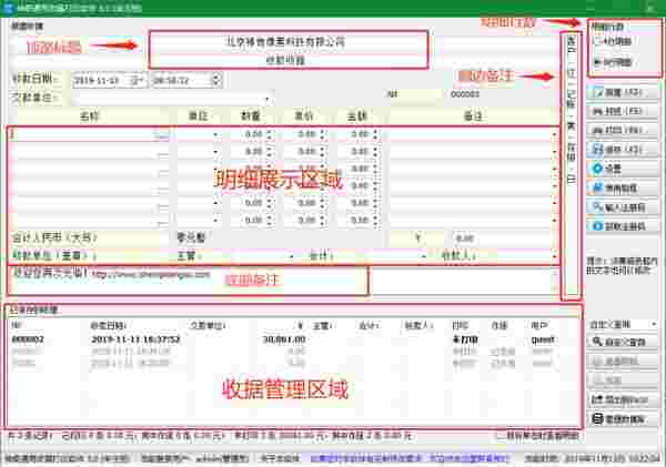 自由设置收据顶部标题1、顶部标题2、侧边备注、底部备注等;