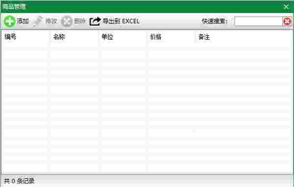 第一步:软件右侧选择“设置-商品管理”,弹出商品管理界面,此界面可以对商品进行添加、修改、删除、导出到Excel等管理,界面如下: