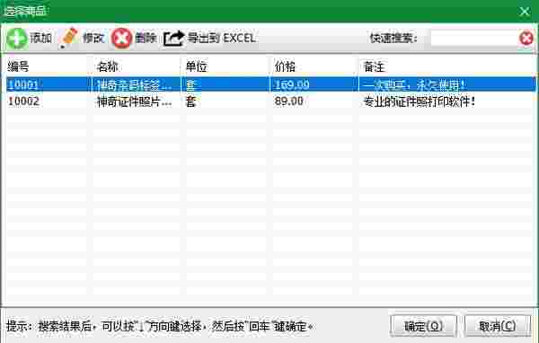 自定义商品列表,支持编号、名称、单位、价格、备注等商品信息的自由录入,不限制数量,提供快速搜索功能;