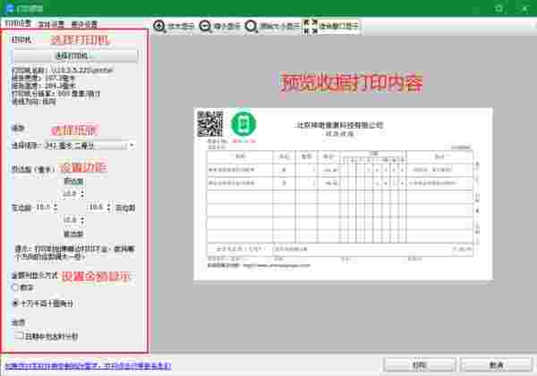 此界面中可以选择打印机、选择纸张、设置页边距、金额列显示方式、日期中是否包含时分秒等;管理员用户还可以设置字体以及更多设置。预览无误后,点击打印即可完成打印。
