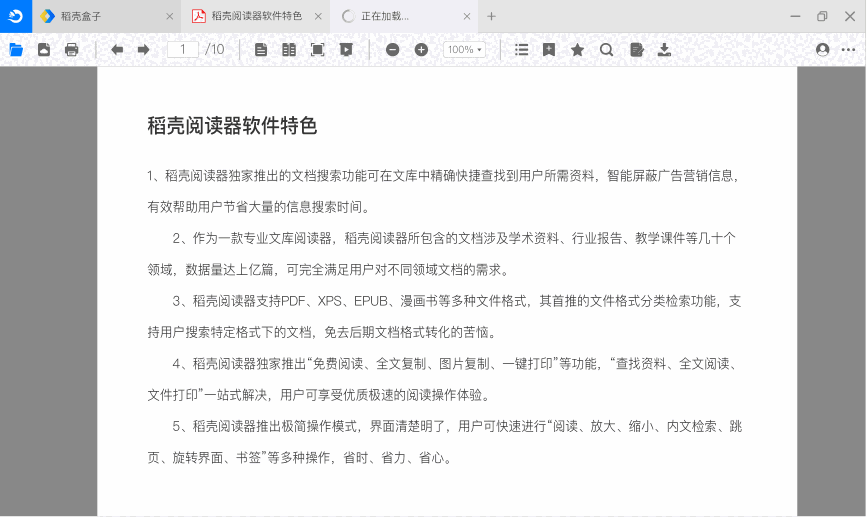稻壳阅读器官方正版是一款功能非常强大的文档阅读软件,软件界面清楚明了,使用起来简单方便,极简操作模式,支持PDF、XDF、XPS、EPUB、MOBI等多种类型文件的本地阅读,有效解决用户找文档难、复制难、打印繁琐等问题,满足用户对不同领域文档的需求,有需要的小伙伴就快来下载体验一下吧!