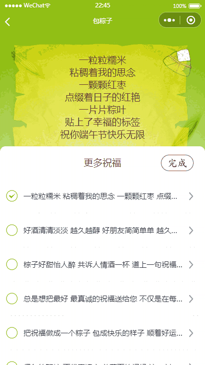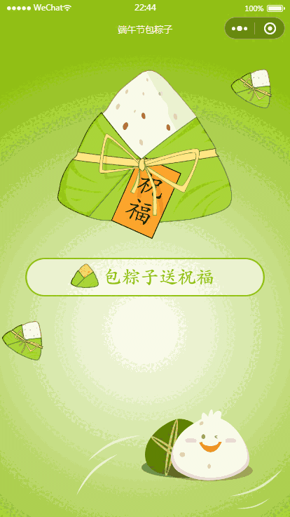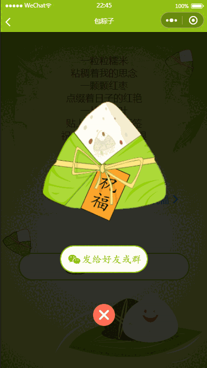 该小程序的作用就是祝福语生成距离端午节也不远了,可以抓住机会蹭一波流量用户可以点击直接发送祝福语给好友,分享的时候会显示用户名字可以自动识别用户头像和名字,用户黏度比较高