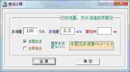 管径计算软件是一款专业的水流速或管径的计算工具软件。使用者可以通过软件计算水的流速和需要的水管管径。软件的使用方法也很简单,输入已知的水流量条件,选择水泵出水或进水,点击运算即可获得计算的水流速和管径结果,十分方便快捷。