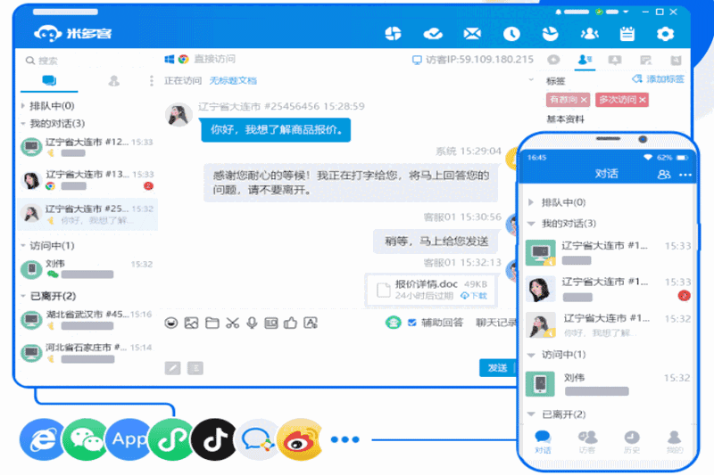 PC网站、移动网站、App、微信个人号、微信公众号和微信小程序客服对话集成,统一对话窗口,统一客服管理界面。