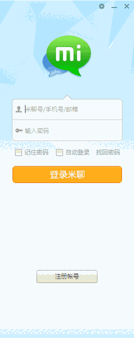 它的登陆界面也显得比较的中规中矩,主要由设置按钮、帐号密码输入框、记住密码自动登陆选项、登陆按钮及注册按钮所组成,没有即时聊天软件常见的登陆状态选择功能。