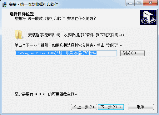 3、选择统一收款收据打印软件安装位置,您可以点击点击【下一步】软件会默认安装,如果您要修改软件安装位置,您可以点击【浏览】在打开的窗口中红,您可以自行选择,选择完成后点击【下一步】继续。