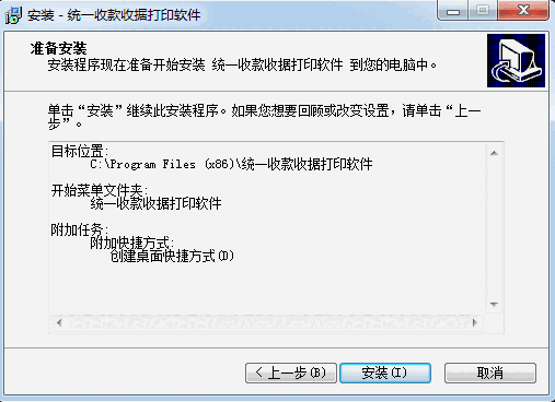 6、准备安装统一收款收据打印软件,点击【安装】开始安装软件,如果您要修改软件,您可以点击【上一步】进行修改。