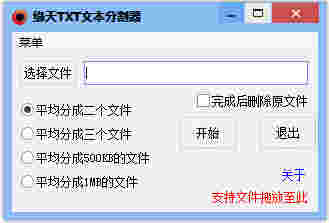 缘天TXT文本分割器是一款专业的txt文本分割的工具软件,支持平均分成二、三个文件以及500k和1mb大小的文件。十分方便快捷,界面简约,布局直观清晰,极易上手,是一款不可多得的利器。
