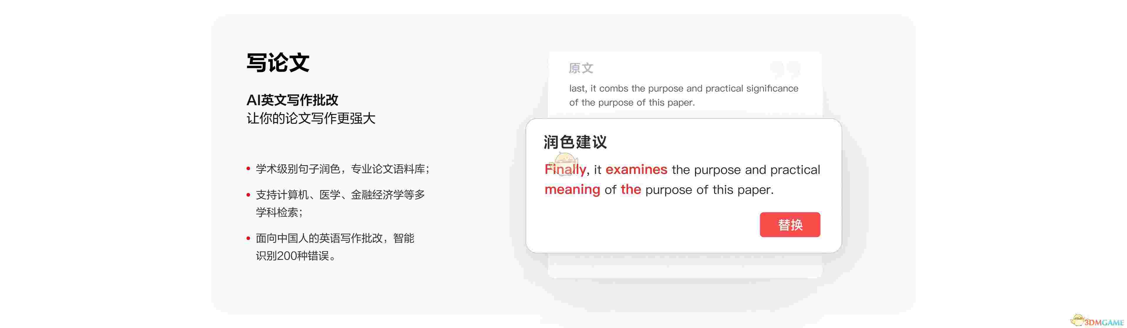 母语级纠错与润色,8类考试评分报告;面向中国人的英语写作批改,识别200种错误类型,提供丰富错误解释。
