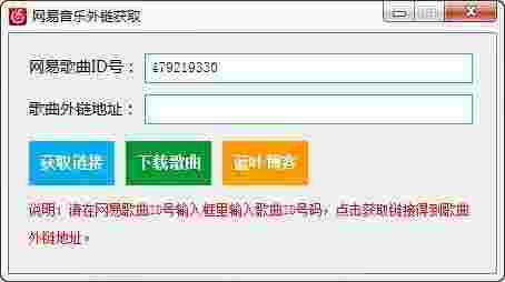 网易音乐外链获取器是一款专业的音乐外部下载的软件工具,你需要将网易云的歌曲ID和外链接输入进软件,就可以下载对应的歌曲。非常方便快捷,软件界面简约,布局直观清晰。操作简单,容易上手,是一款十分实用的工具。