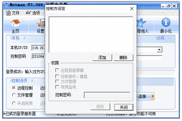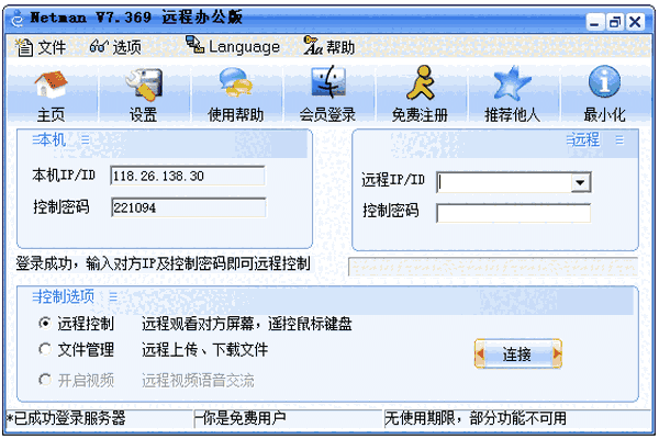 网络人远程控制软件office版在运行后,会显示本机IP,并随机生成一个控制密码,输入对方的IP和控制密码即可连接远程电脑。电脑或软件重启后,随机生成的控制密码会随机变化,通过注册免费会员ID可设置固定密码,即可避免密码变化的问题。在自己的网络人软件上登陆会员号,并设定一个控制密码,今后在世界上任何一个能上网的地方,都可以通过网络人软件远程连接到你的电脑,实现远程办公、远程协助、远程维修电脑等各种远程操作。