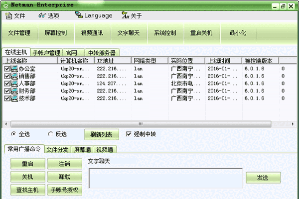远程命令控制:远程开机(需配合使用网络人电脑控制器硬件)、远程关机、远程重启、远程注销、锁定本地或远端电脑的鼠标键盘等。
