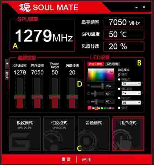 耕升SOUL MATE官方版通过LED设置,可以实现对显卡PCB LED以及散热器LED模块设置不同的发光效果。