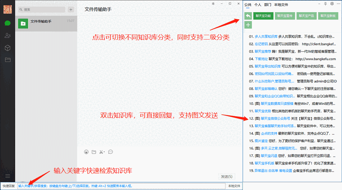 聊天宝客服聊天助手是一款专业的客服聊天辅助的软件工具,软件支持吸附在微信、QQ等主流聊天软件上,提供公共知识库、个人知识库、部门知识库供用户选择进行快捷发送。非常方便快捷,软件界面简约,布局直观清晰。操作简单,容易上手,是一款十分实用的工具。