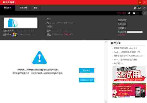 界面的上半部分,显示的是电脑重要信息,如:电脑型号,序列号(SN),操作系统,硬件信息,以及保修信息。还有目前的驱动的安装情况。蓝色数字代表已安装的,红色数字代表未安装的;仪表盘很容易的说明了电脑驱动的安装情况。