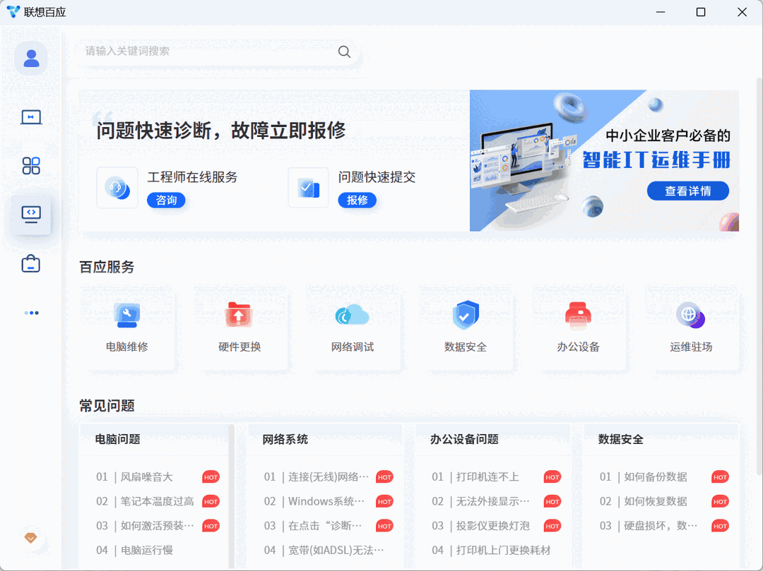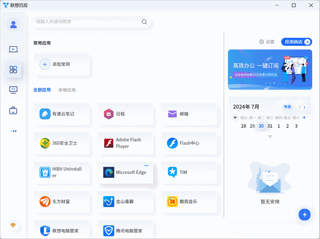 联想百应是一款功能强大的智慧办公软件,软件界面十分整洁清晰,操作也简单容易上手,具备了多项实用的办公功能,支持多人协作、资产管理等操作,解决企业通讯、企业/个人工作台、IT服务获取、办公应用订阅、办公设备检测与管理,满足用户的不同需求,让办公随时开展更有效率,有需要的朋友可以下载体验一下!