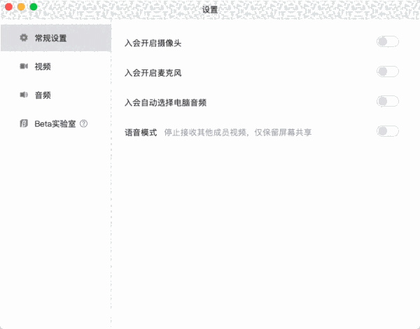 点击该按钮,即可唤出设置窗口,您可以在该窗口进行设备信息检测,查看您的摄像头、麦克风、扬声器是否被识别,同时可进入Beta实验室,体验最新黑科技