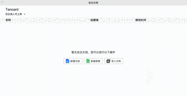 点击该按钮,即可唤出文档窗口,您可以在该窗口创建文档,并且决定是否邀请会中成员协作。同时您也可以选择导入本地的文档,然后在会议中和其他成员共同协作,您在会后可以在Web个人中心中查看您的文档记录