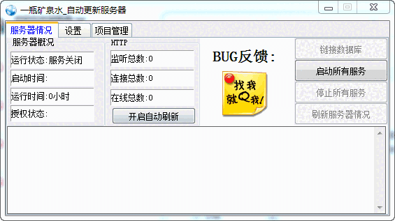 自动更新服务器是一款专业的服务器的自动更新工具软件。使用者可以通过软件来查看服务器的概况包括运行状态、监听总数、启动时间、连接总数等等内容。软件也支持自动生成以及测试api,能够为使用者管理更新服务器提供帮助。