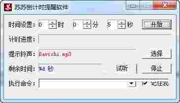内置一首提示铃声Davichi.mp3(文件已隐藏),支持自定义铃声(也可以当简单的音乐播放器使用),剩余时间仅支持以秒钟显示,支持倒计时结束后执行自定义命令(内置5条实例命令),例如运行某些程序或关机操作等!