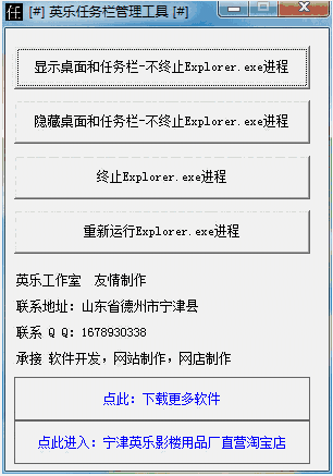 英乐任务栏隐藏显示器是一款系统桌面任务栏管理工具,可以在不终止任务管理器程序的情况下一键隐藏/显示桌面任务栏,并且提供了终止或windows资源管理器的功能,可以用来解决一些windows资源管理器假死的问题。
