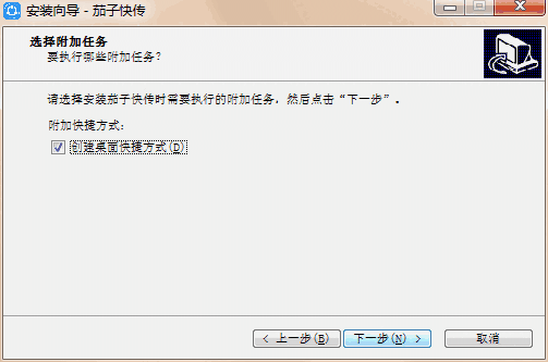 4、然后选择附加任务:为了以后可以快速找到茄子快传软件,建议大家勾选“创建桌面快捷方式”选项,点击下一步继续。