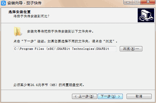 3、接着为茄子快传软件选择一个合适的安装位置,默认是安装在C盘,为了不影响软件的使用及电脑运行速度,建议大家点击路径后面的浏览按钮选择非系统盘的位置。选择好茄子快传的安装目录,点击【下一步】。