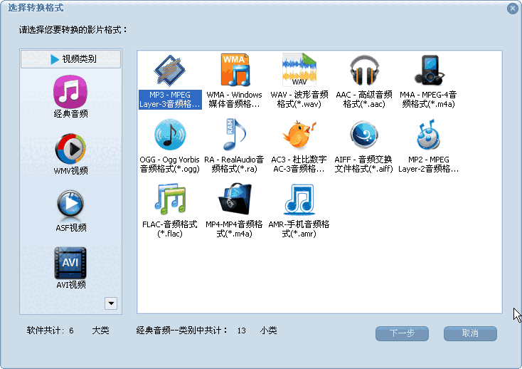 主要功能是将各种视频格式或音频格式转换为MP3音频格式。比如您可以将WMA转换为MP3, AAC转换为MP3, WAV转换为MP3, MP2转换为MP3,