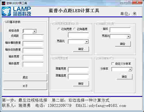 蓝普LED计算工具是一款专业的LED显示材料的计算工具软件。使用者可以通过软件快速计算需要的led显示屏材料。使用方法也很简单:预设好已知宽高比、已知面积和比例、已知宽度和高度或是已知分辨率尺寸以及规格选择就可以直接计算点间距等led所需材料。