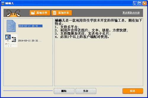 蛐蛐儿是一款专业的文件传输的软件工具,软件支持不同平台的文件传输、不同文件的传输、利用声音传输文件等功能。非常方便快捷,软件界面简约,布局直观清晰。操作简单,容易上手,是一款十分实用的工具。