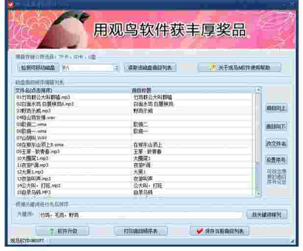 观鸟电媒排序软件是一款专业的MP3排序的软件工具,软件支持按关键词排序MP3、wma、wav。支持清除无效混乱的曲目tag。非常方便快捷,软件界面简约,布局直观清晰。操作简单,容易上手,是一款十分实用的工具。