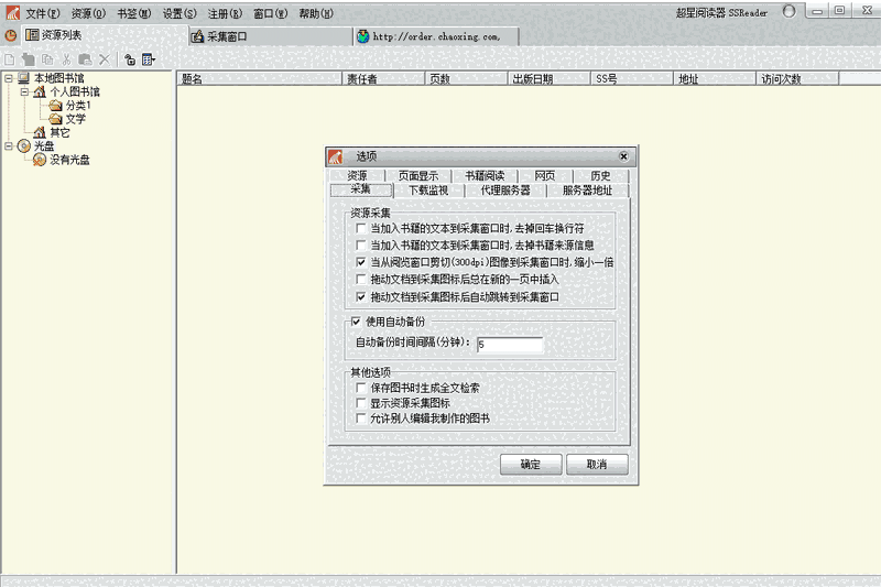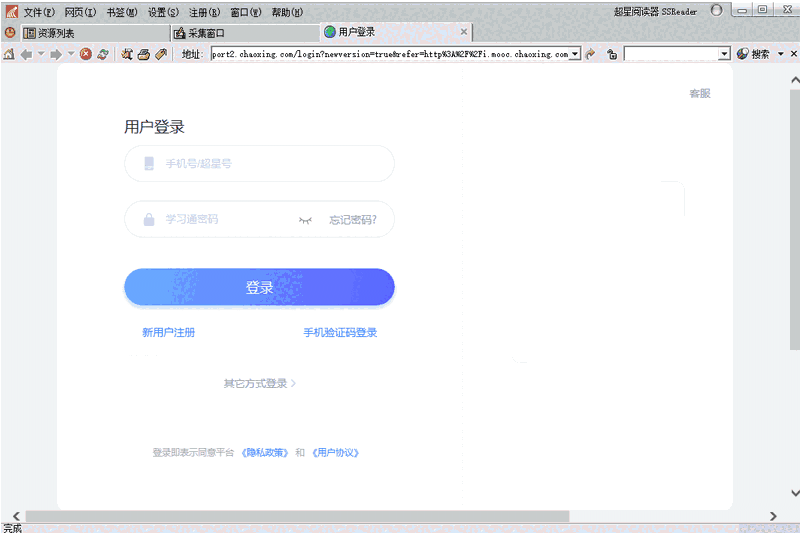 主菜单:包括超星阅览器所有功能命令,其中“注册”菜单是提供给用户注册使用的,“设置”菜单是给用户提供相关功能的设置选项。功能耳朵:包括“资源”、“历史”、“交流”、“搜索”、“制作”