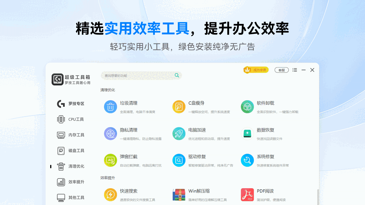 6、系统清理工具:集成系统清理功能,帮助用户快速清理无用文件和临时数据,优化系统性能。