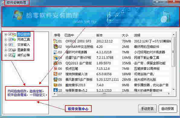 制作,支持32位、64位系统。安装方式分为手动安装和自动安装,将繁琐的软件安装过程自动化,一键完成。内置软件均精挑细选,精心整理,既保持官方版本的稳定,又去除广告,使之更加纯净清爽。拾零软件安装助理