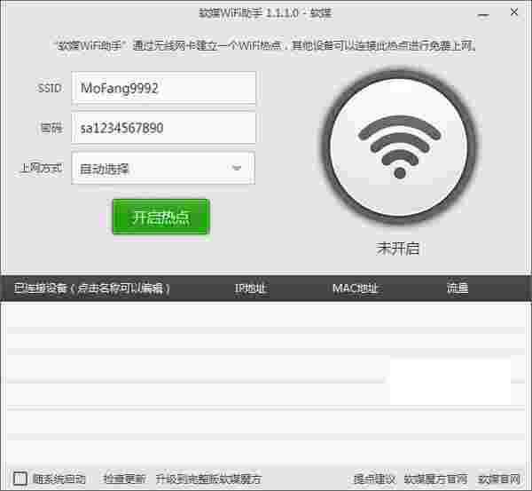 软媒WiFi助手是一款专业的共享WiFi的软件工具,软件可以帮助你带无线网卡的电脑新建一个wifi热点供你的其它设备连接上网。非常方便快捷,软件界面简约,布局直观清晰。操作简单,容易上手,是一款十分实用的工具。