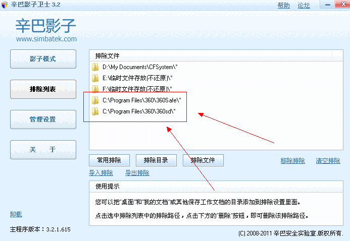 排除保存:辛巴影子卫士的可以把你需要保存的文档排除在影子保护之外。
