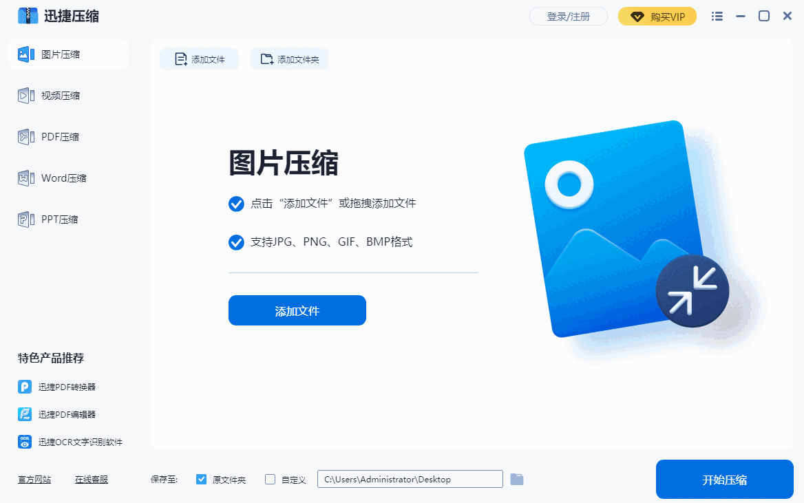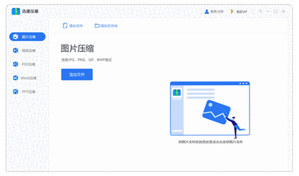 可对图片文件进行压缩处理,缩小文件存储内容。支持添加JPG、PNG、GIF、BMP图片格式。